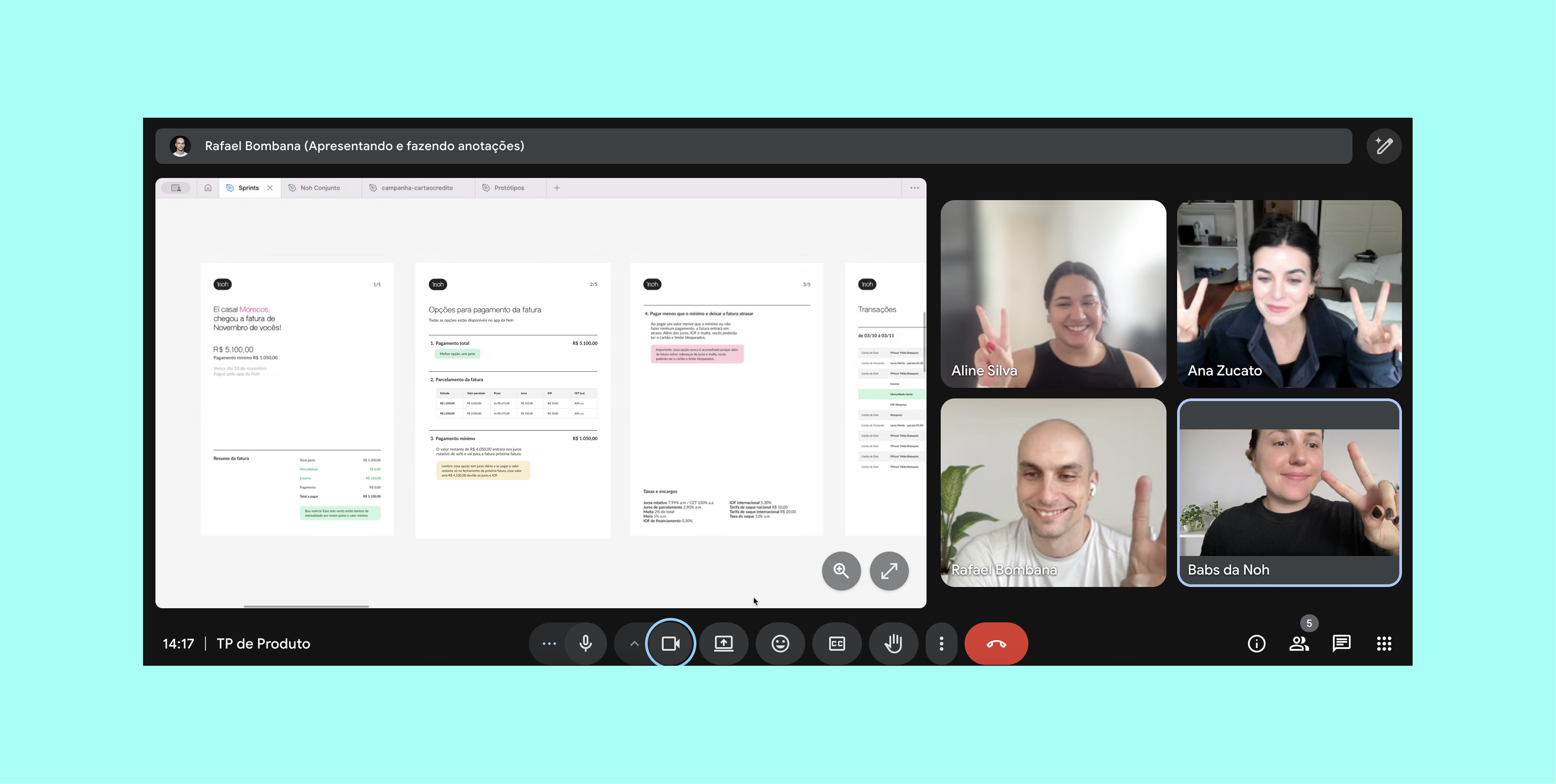 Essa é uma das reuniões do time de Produto (aka Techis) em que o DD mostrou como está ficando o cartão dentro do app. Foi o momento de ver a navegação pela home e como está ficando a experiência.